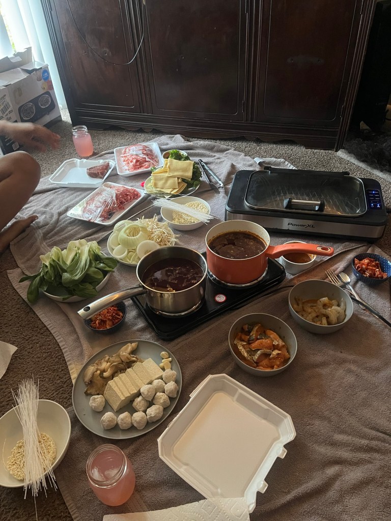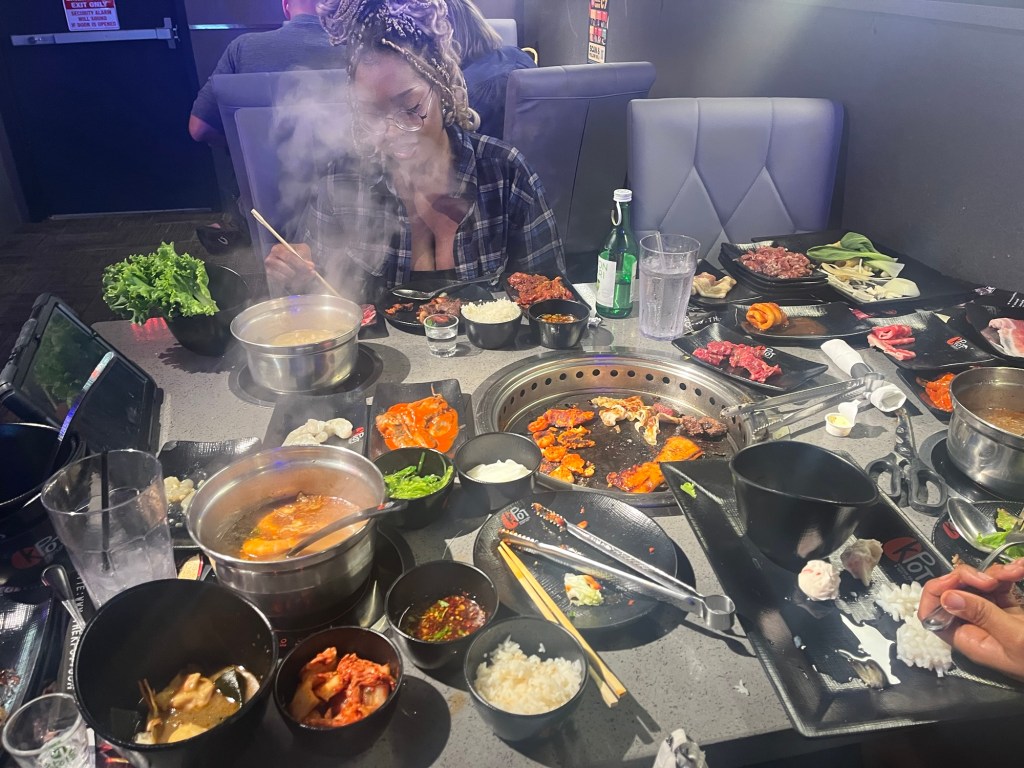 I do not eat meat other than seafood, so we separated the grill for myself and my sisters. This restaurant offers an all-you-can-eat experience, which is worth it. The price is $19.99 per person for lunch and $29.99 per person for dinner. While this may sound expensive, it is reasonable if you go with a group and split the check. We enjoyed soju and cocktails, which are additional costs, along with free water. The hotpot is an extra $5 per person, and everyone must either choose it or agree not to. Their policy states that if one person wants it, everyone is still charged for it, so you must either agree to all get it or agree not to. I am not a fan of this policy, as some may want the hotpot while others may not. If you opt for the hotpot, you can place a variety of hotpot ingredients on the grill.