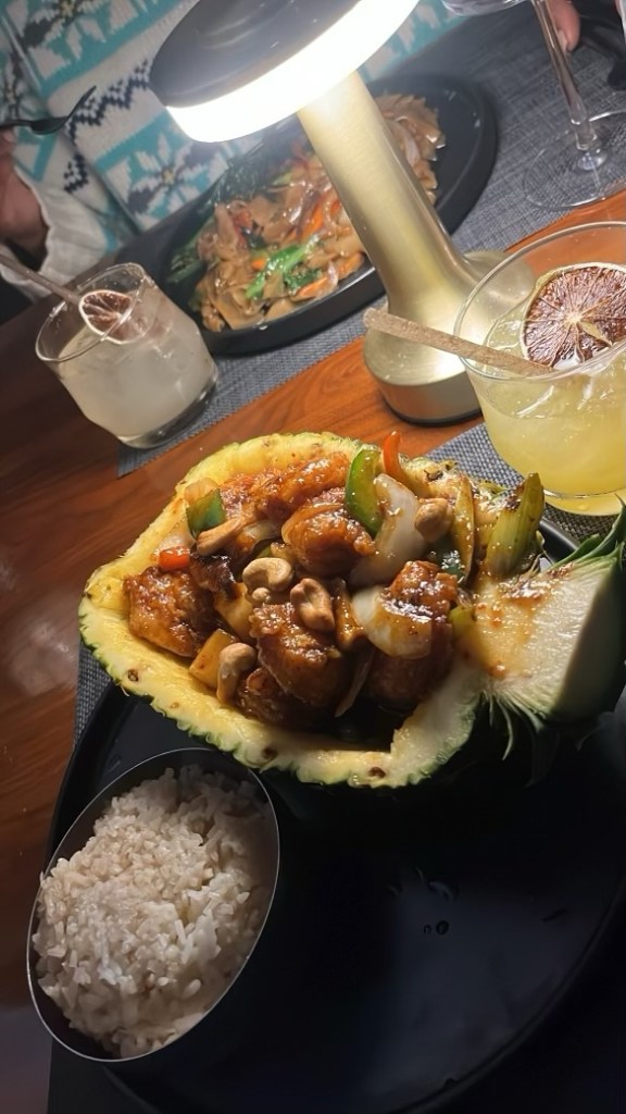 Have you ever been to Thailand? I have not, but this food will make you feel as though you have. If I ever visit, I will indulge in the cuisine. The dishes are so well-seasoned, and the flavors are captivating. I enjoy describing food that I love. My favorite was the stuffed pineapple, which featured battered jumbo shrimp that were deep-fried with coconut. They sautéed it with peppers, basil, mushrooms, cashews, and chopped pineapple. It was incredibly fresh! I am not joking when I say that I ate the entire dish.