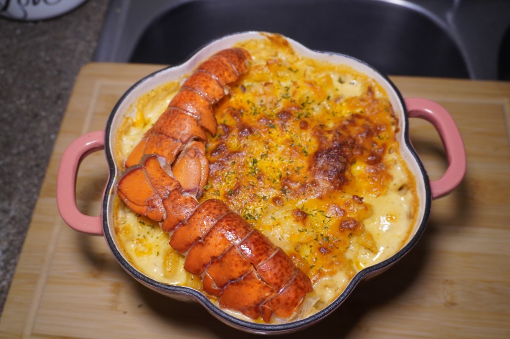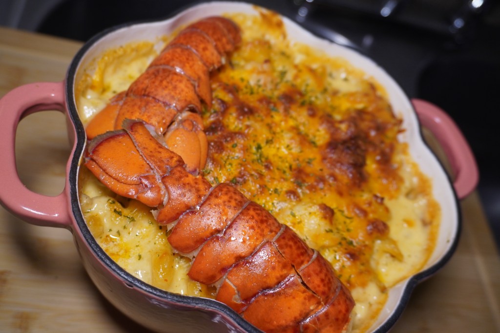 All I needed was lobster, shrimp, heavy cream, milk, shredded cheese, seasonings, and bake along for 40 minutes for 350 degrees.